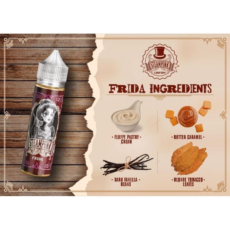 Η Frida γεννήθηκε στο Λαρέντο, στην πόλη που ανήκει ταυτόχρονα και στο Μεξικό και στη Αμερική.. Βαθιά επηρεασμένη από τους δύο κόσμους ανέπτυξε μια δικιά της φιλοσοφία… Τα έντονα χρώματα πάντα ήταν ένα αναπόσπαστο κομμάτι της ζωής της, όπως και το πολύχρωμο πακέτο τσιγάρων που πάντα την συντρόφευε… Επηρεασμένοι από την έντονη προσωπικότητα της, δημιουργήσαμε μια αφράτη κρέμα ζαχαροπλαστικής αρωματισμένη με καραμέλα βουτύρου και λοβούς σκουρόχρωμης βανίλιας… Συνδυάσαμε αυτό το γλυκό μείγμα με ξανθά φύλλα καπνού για να δημιουργήσουμε μια εξωτική καπνική γεύση…